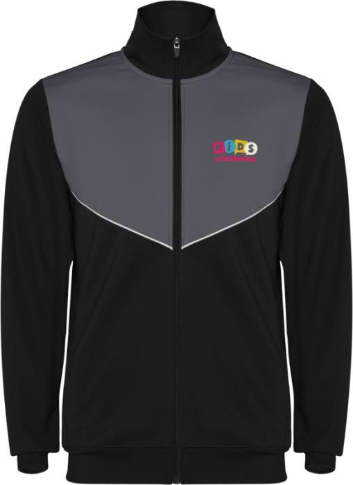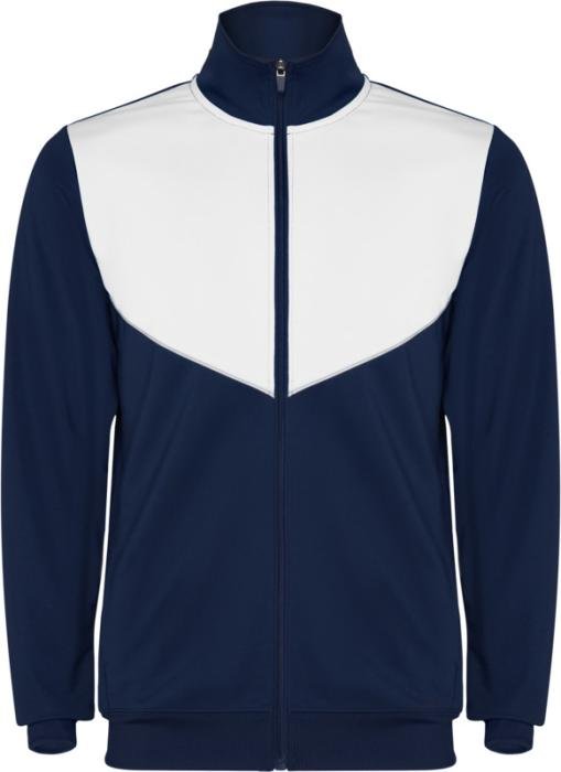 Tracksuit in lightweight and elastic fabric. Jacket with contrasting colour and sewing trims on the chest. High collar with contrasting seams. Center front zip. Side pockets. 2×2 ribbed cuffs and waist. Trousers with elastic waistband and drawstring. Contrasting side piece with sewing trim. Zipped hem. Interlock knit of 100% Polyester, 225 g/m2.